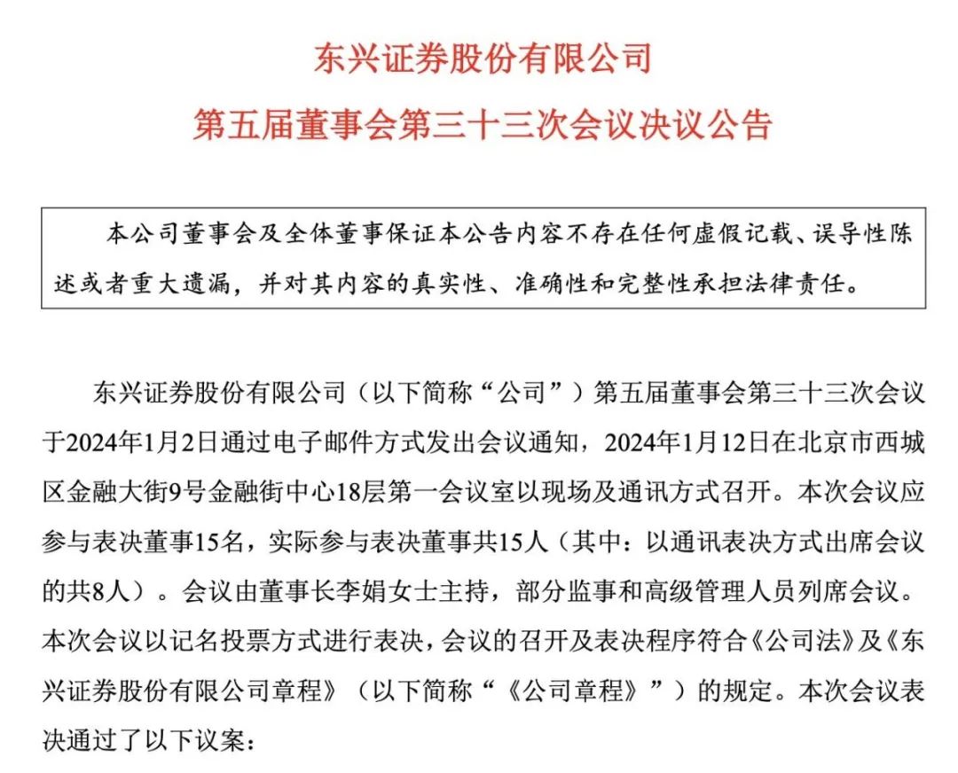 东兴证券公告称,公司第五届董事会第三十三次会议于2024年1月2日通过电子邮件方式发出会议通知,2024年1月12日在北京市西城区金融大街9号金融街中心18层第一会议室以现场及通讯方式召开。