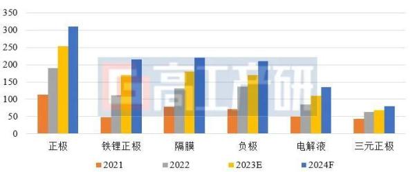 在材料端,预计2024年中国锂电池行业的四大主要材料的出货量都将实现超过20%的同比增长。正极材料的出货量将超过300万吨,锂电隔膜的出货量将超过220亿平方米,负极材料的出货量将超过200万吨,电解液的出货量将超过130万吨。