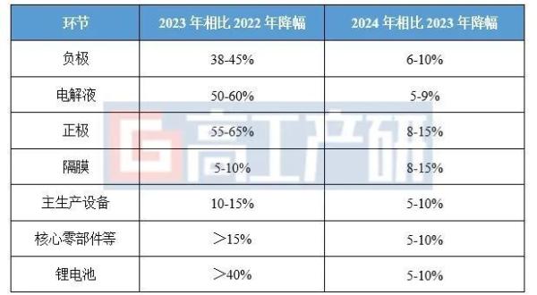 在产品价格方面,预计2024年锂电池产业链主要环节产品价格在2023年基础上降价幅度在5—15%。其中负极、电解液等环节降幅5—12%,正极、隔膜等降幅8—15%。除材料外,2024年锂电生产设备及相关零部件的价格也将在2023年的基础上继续下降。原材料及零部件价格下降带动电池成本降幅5~10%,锂电池成本将在现有基础上再下降0.03-0.06元/Wh。