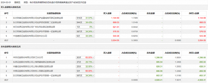 具体来看,华安证券浙江分公司、东吴证券上海西藏南路证券营业部分别卖出1286.90万元、885.84万元;东方财富证券拉萨金融城南环路证券营业部、东方财富证券拉萨团结路第二证券营业部分别买入1144.59万元、668.03万元。